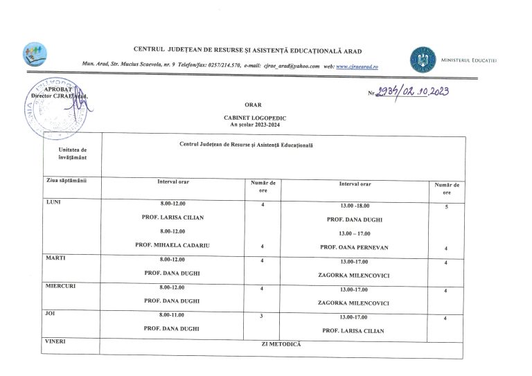 · 3 profesori logopezi care deservesc unități de învățământ din județul Arad, în care nu sunt înființate cabinete logopedice.